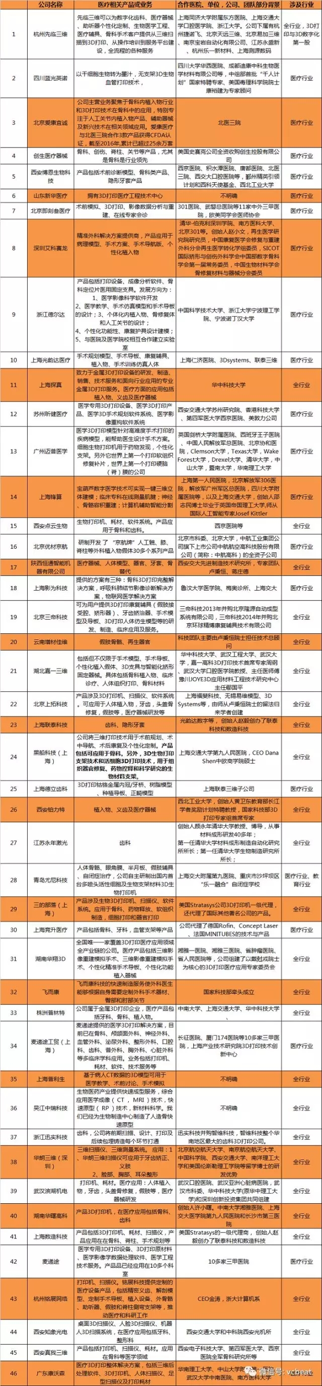 在做這個(gè)選題之前,本以為國(guó)內(nèi)的相關(guān)企業(yè)會(huì)很少,可是此次盤(pán)點(diǎn)動(dòng)脈網(wǎng)一共找到46家與3D醫(yī)療打印相關(guān)的企業(yè)(由于時(shí)間和信息量的關(guān)系,相信我們收集的數(shù)據(jù)并不全面,未收錄到的企業(yè)和機(jī)構(gòu)請(qǐng)與我們聯(lián)系)。