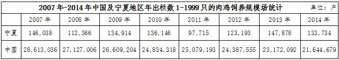 不僅如此,在肉雞飼養(yǎng)場的規(guī)模上也有明顯的差距。據(jù)wind數(shù)據(jù)統(tǒng)計,2014年,寧夏區(qū)內(nèi)肉雞年出欄數(shù)在1-1999只的肉雞飼養(yǎng)規(guī)模場戶數(shù)為133734戶,當(dāng)年全國同規(guī)模的飼養(yǎng)場戶數(shù)高達(dá)21644679戶,占比為0.62%;年出欄數(shù)在2000-9999只的肉雞飼養(yǎng)規(guī)模戶數(shù),寧夏地區(qū)為723戶,全國為258379戶,占比0.28%;年出欄數(shù)在10000-49999只的肉雞飼養(yǎng)規(guī)模戶數(shù),寧夏地區(qū)為91戶,全國為132780戶,占比為0.07%。