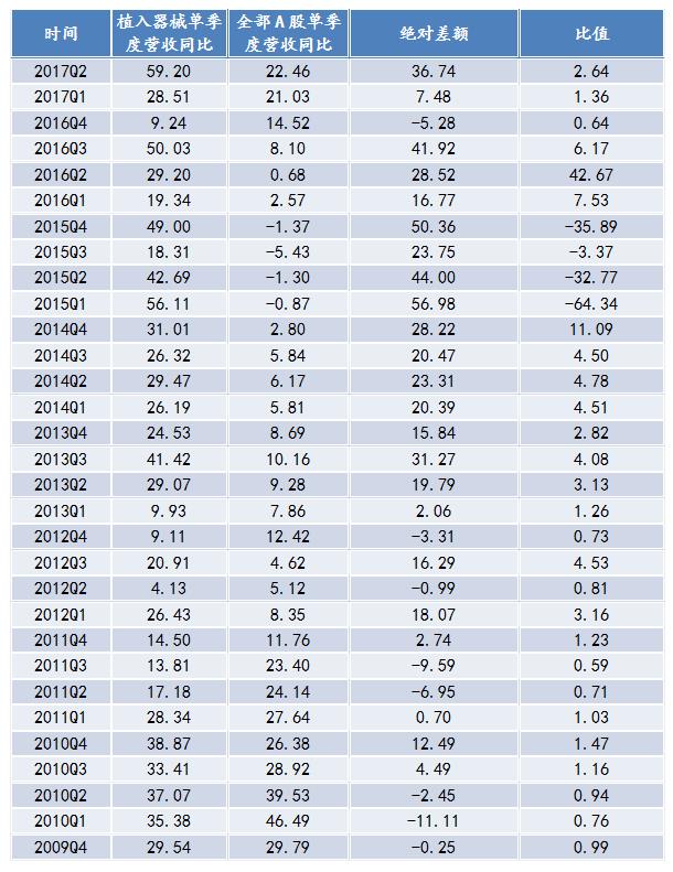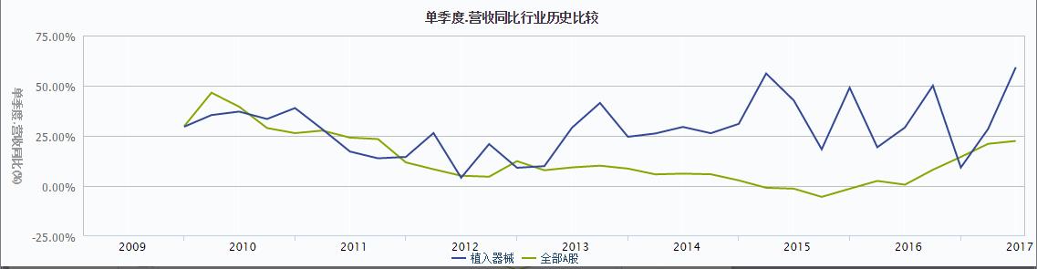 根據(jù)與全部A股營收相比較,在2012年之前,植入器械的營收總體上與全部A股的保持一致。2012年之后,全部A股的營收變動(dòng)相對平緩;而植入器械行業(yè)營收基本高于全部A股營收,在2016年經(jīng)歷谷值之后,行業(yè)保持增長的趨勢。