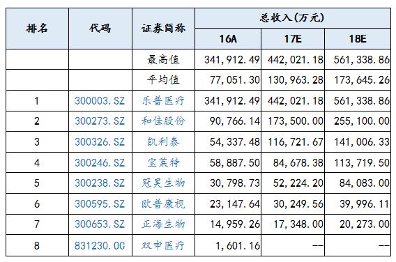 通過對植入器械上市公司的盈利做出預(yù)測,上市公司總收入的平均值在2017年、2018年預(yù)計(jì)分別是130,963.28萬元、173,645.26萬元,相對于2016年的77,051.30萬元,呈現(xiàn)逐年增長的趨勢;其上市公司盈利最高值預(yù)測值在2017年、2018年分別達(dá)到442,021.18萬元、561,338.86,相較于2016年的341,912.49萬元,呈現(xiàn)逐年增長的趨勢,市場總體看好植入器械上市公司。