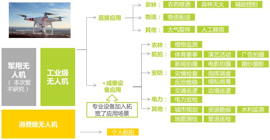 無人機的設(shè)計概念最早應(yīng)用于軍工領(lǐng)域。由于軍工設(shè)備具有較強的技術(shù)保密和行業(yè)壟斷性質(zhì),民營企業(yè)和資本很難獲得準入。隨著世界范圍內(nèi)軍民融合戰(zhàn)略的實施和推進,近幾年無人機技術(shù)在民用領(lǐng)域的應(yīng)用獲得長足發(fā)展。根據(jù)無人機應(yīng)用領(lǐng)域,可分為消費級無人機和工業(yè)級無人機。消費級無人機主要應(yīng)用于個人航拍,工業(yè)級無人機廣泛應(yīng)用于農(nóng)業(yè)植保、國土勘測、安防和電力巡檢等領(lǐng)域。