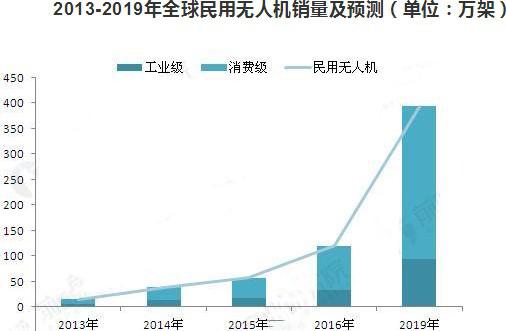 2015年,民用無人機銷量約為56.9萬架,其中,工業(yè)級無人機銷量約為17.1萬架,消費級無人機銷量約為39.8萬架。據(jù)IDC預(yù)測,到2019年全球民用無人機銷量預(yù)計可達393萬架,其中,消費級約為300萬架,年均復(fù)合增長率為60%,工業(yè)級約為93萬架,年均復(fù)合增長率為45%。